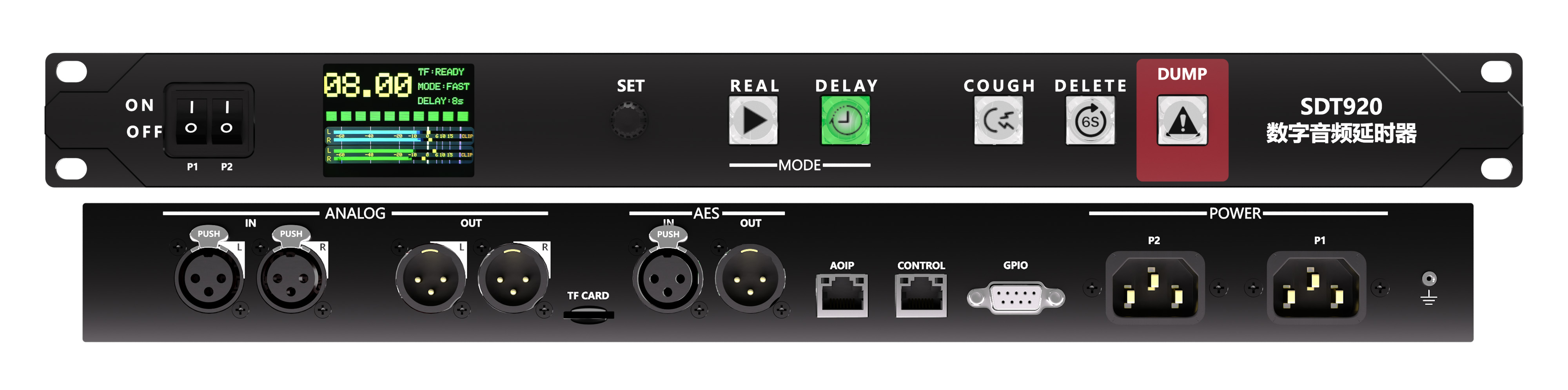 SDT920数字音频延时器是专为广播电台或广播发射机房等应用场景设计的一款安全直播延时和应急垫乐设备,本设备采用全铝机身,标准1U尺寸的设计规格。双宽幅AC冗余电源以及全国产元件,全中文操作界面,通过音频时间伸缩算法从而实现在“建立延迟”和“拆除延时”过程中动态改变音频播放速度、过渡平滑自然不易察觉。设备提供了长达85秒的延时保护时间,并拥有AOIP、AES/EBU、模拟音频输入输出接口。REMOTE网络接口允许SDT与Rebox外控盒或中控系统进行连接。机身自带TF卡槽,通过“Dump”键或低电平自动检测功能从而实现紧急情况下自动垫乐的功能,SAUDIO特有的“零”中断技术充分的保障了播出安全。